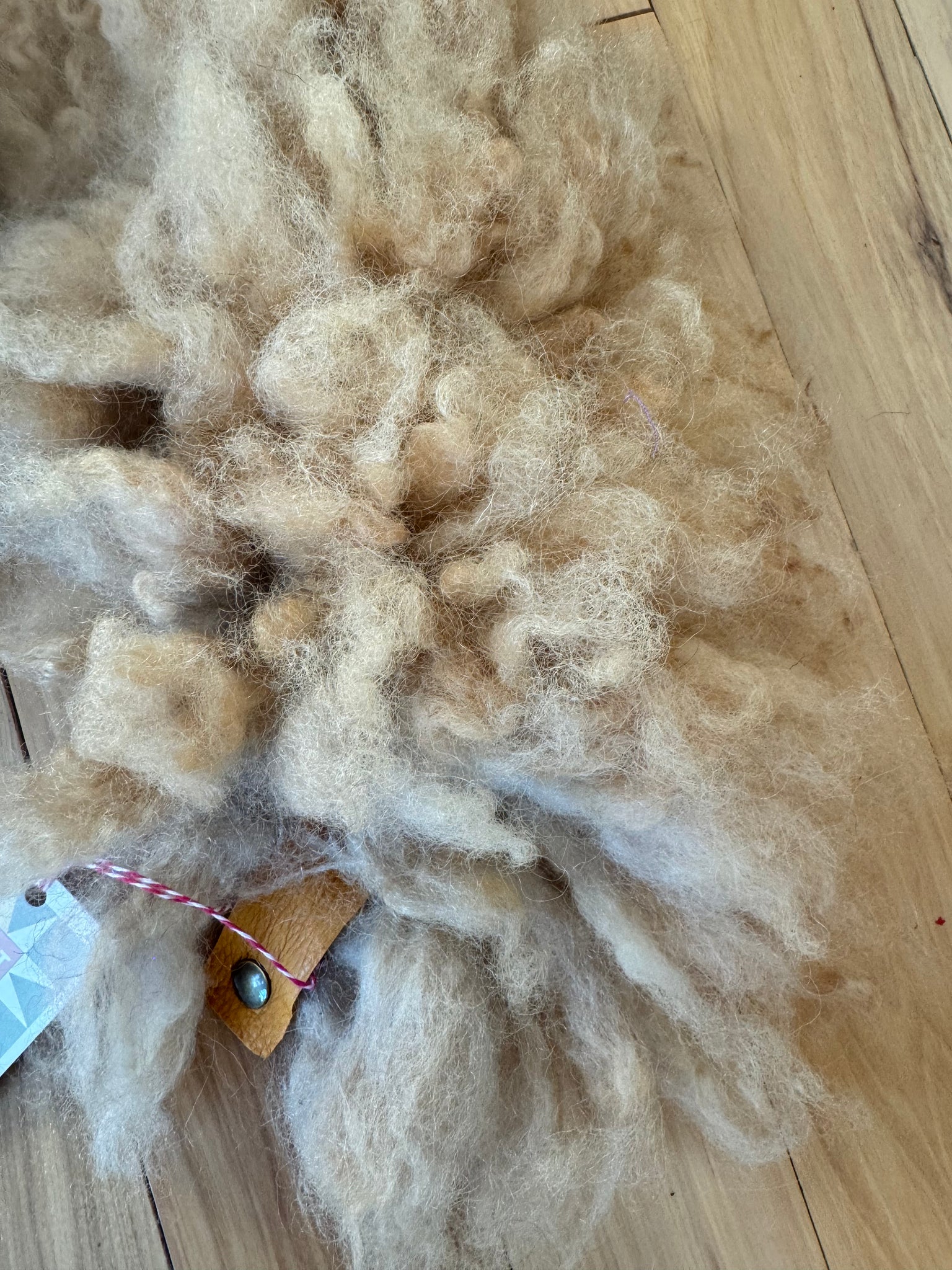 The collar is 1 of 1, unique in both size and wool texture, color, and length. It is finished with a deerskin clasp enclosure.
