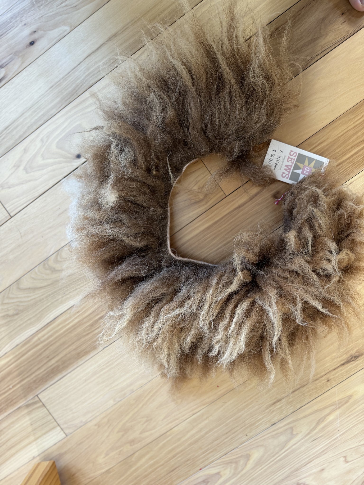The collar is 1 of 1, unique in both size and wool texture, color, and length. It is finished with a deerskin clasp enclosure.