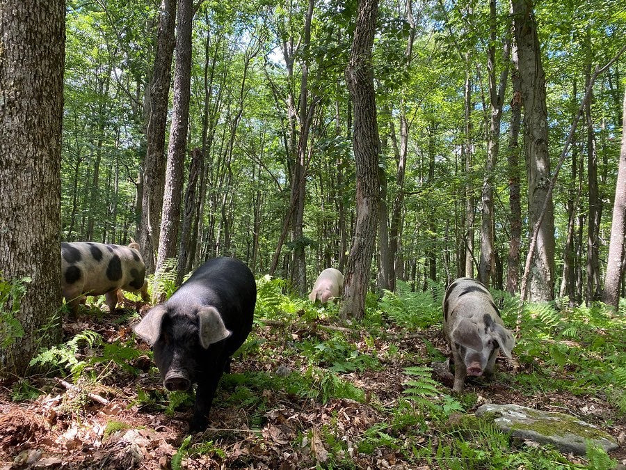 Our heritage breed pigs are raised in the forest where they have a diverse mix of forage, plenty of shade and cover, and room to root. They are consistently rotated to new areas which allows them to access fresh forage and explore new territory while also giving the soil adequate time to rest recover and regenerate. The pigs are given whey from a local cheesemaker and certified organic feed that is corn/soy free.